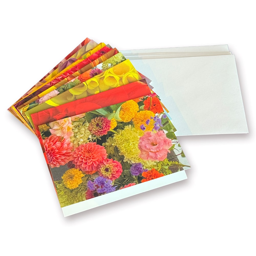 A set of 10 glossy notecards, each featuring a different flower photograph, paired with white envelopes. Beautifully packaged in a clear box with a bow—perfect for gifting or personal correspondence.